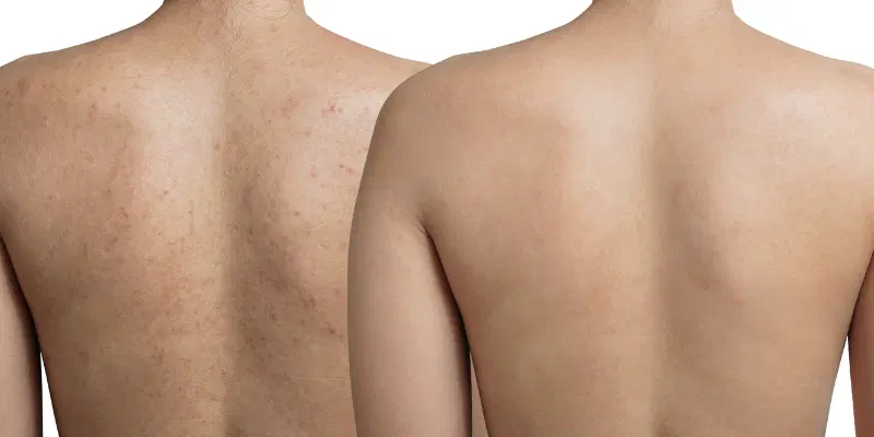 After a series of treatments, a process of skin repair works to improve the look of the back and/or shoulder area, including: